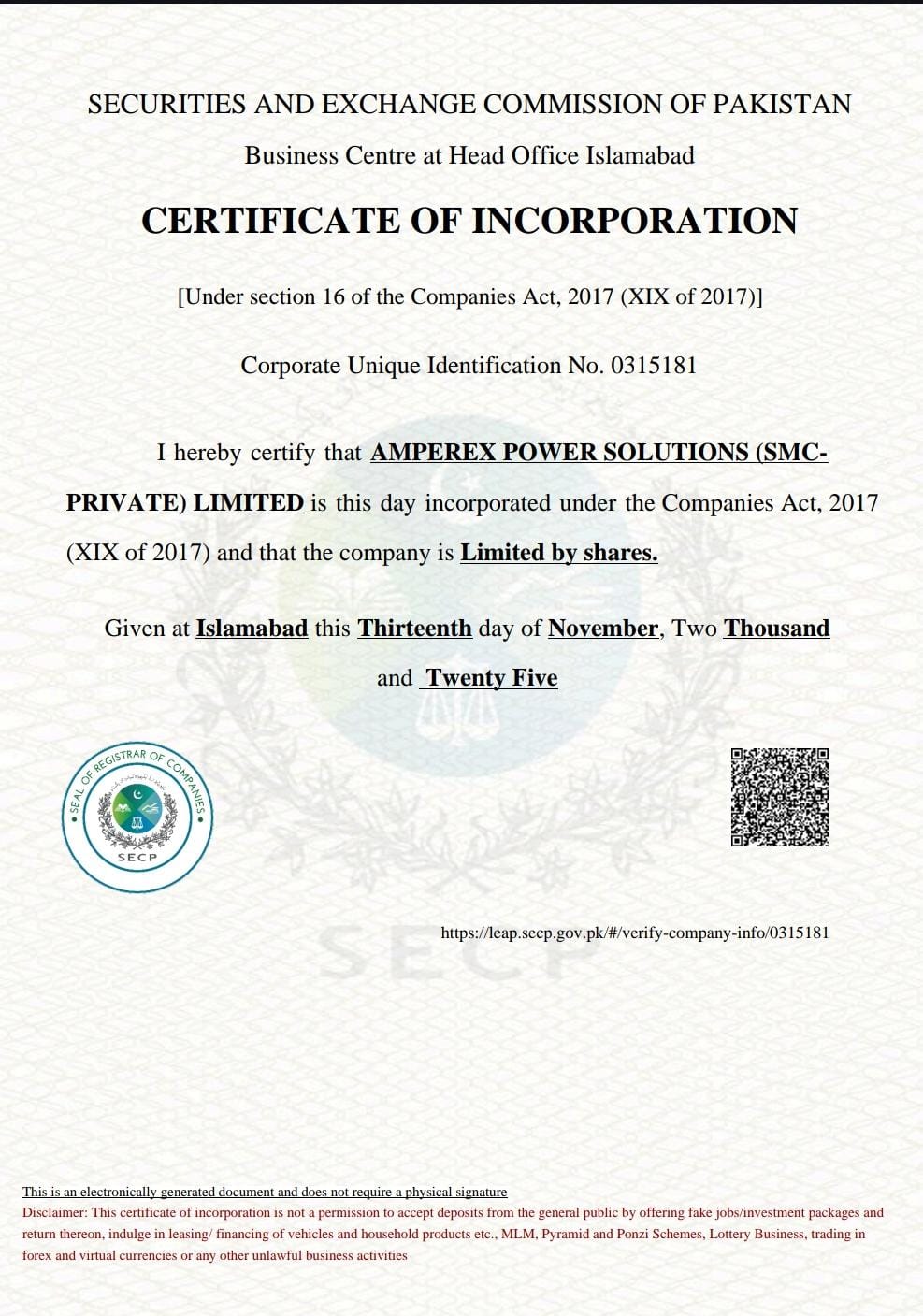 Official certificate of incorporation for AmpereX Pakistan, demonstrating our legal registration and compliance with Pakistani corporate law.