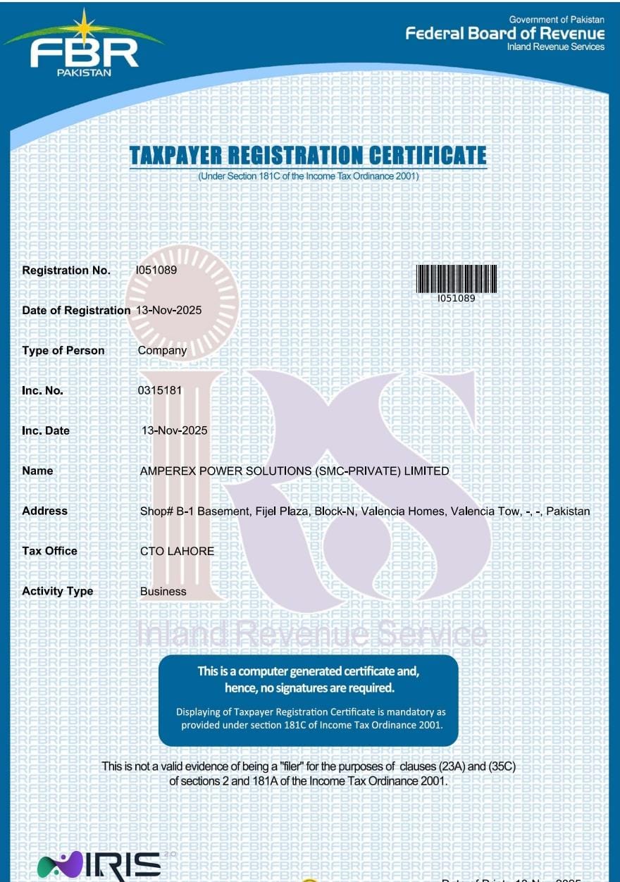 All legal documents, certificates, and licenses for AmpereX Pakistan are displayed below. These documents demonstrate our commitment to legal compliance and business transparency.